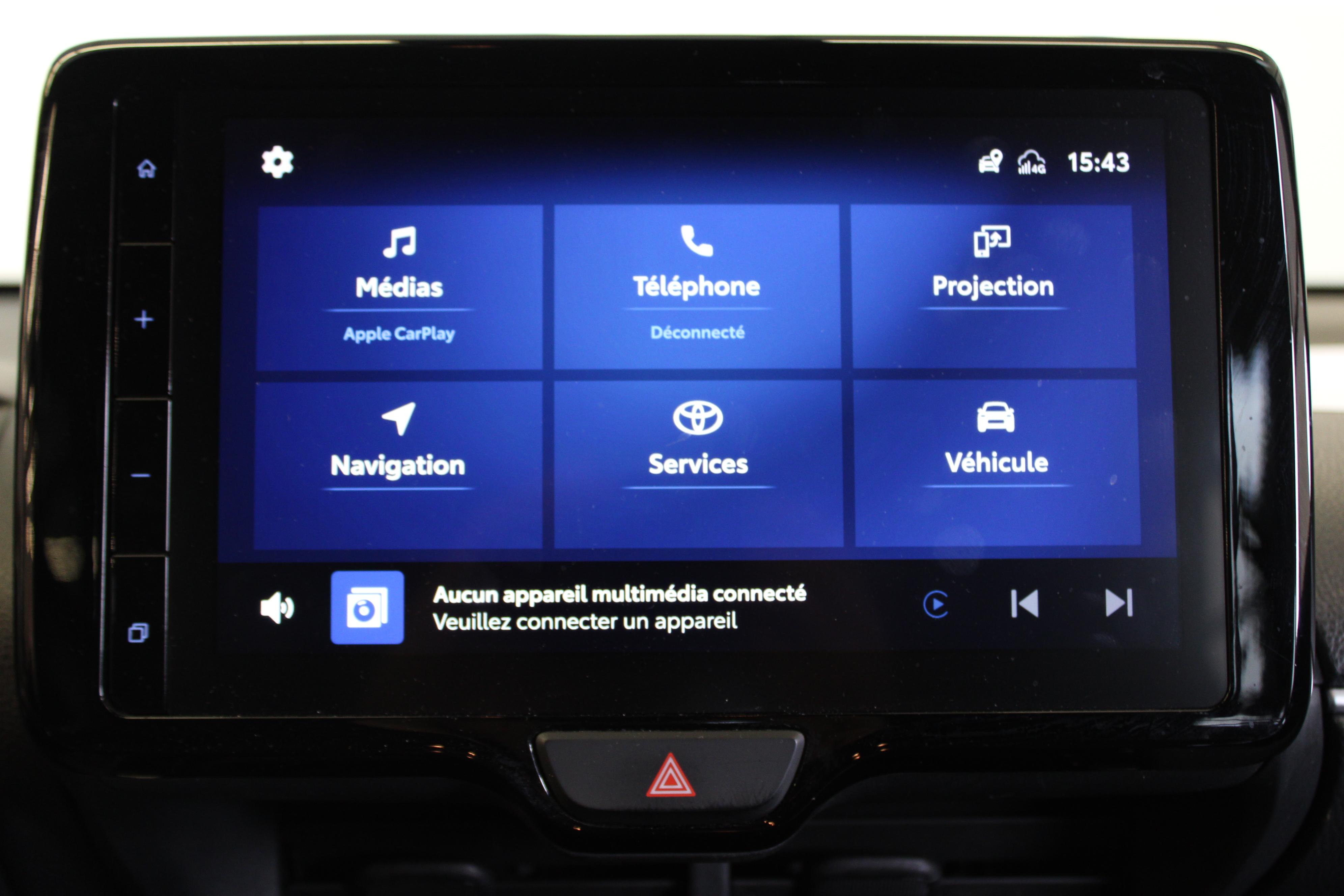 - Système multimédia Toyota Smart Connect : écran tactile 9", navigation connectée et contrôle à distance via l'application MyT (verrouiller/déverrouiller, climatisation et retrouver ma voiture avec allumage des feux clignotants)
