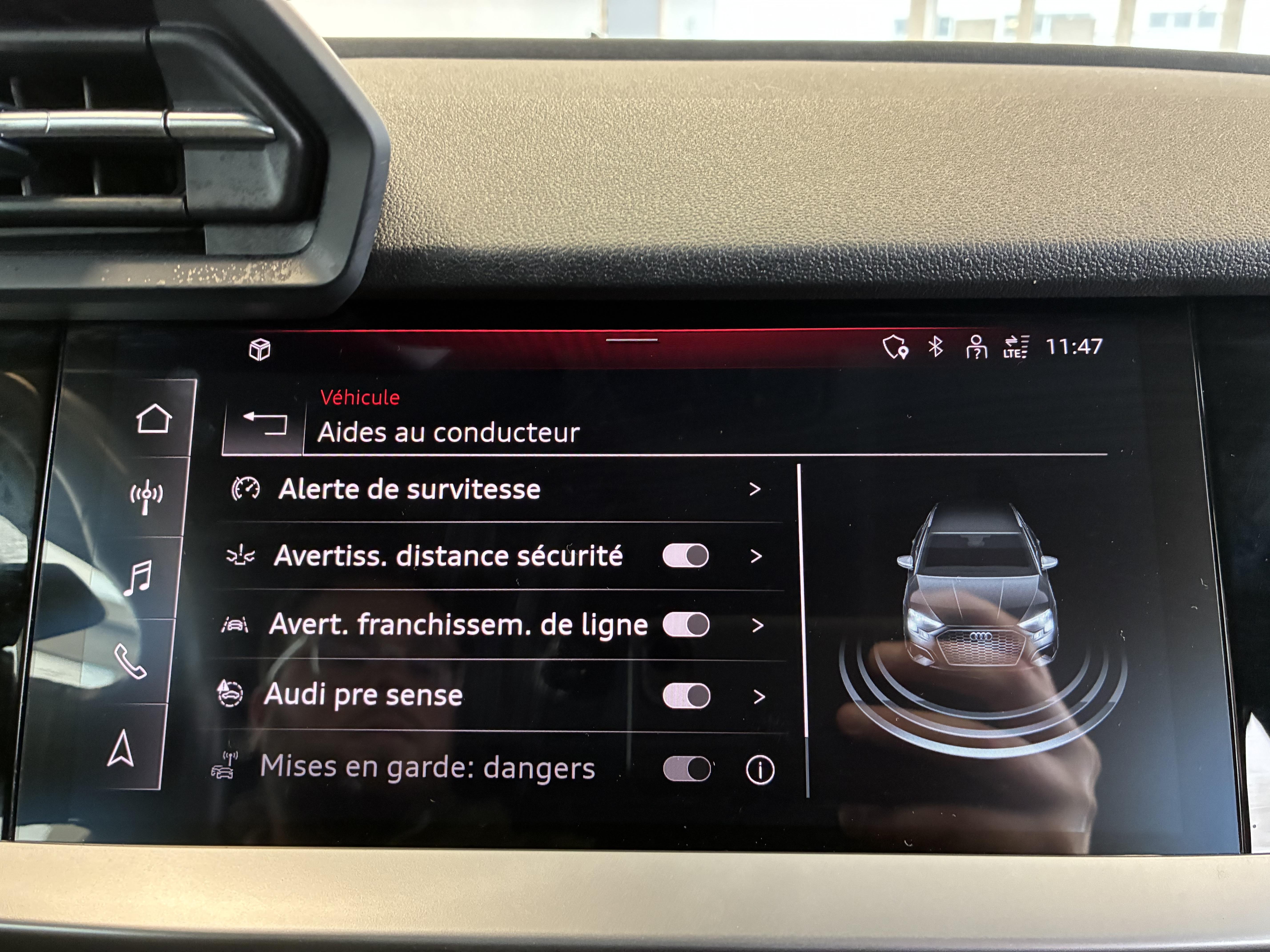- Audi park assist : cherche à l'aide de capteurs à ultrasons les places de stationnement (bataille et créneau) appropriées le long de la chaussée, calcule le créneau idéal et gère le braquage automatiquement