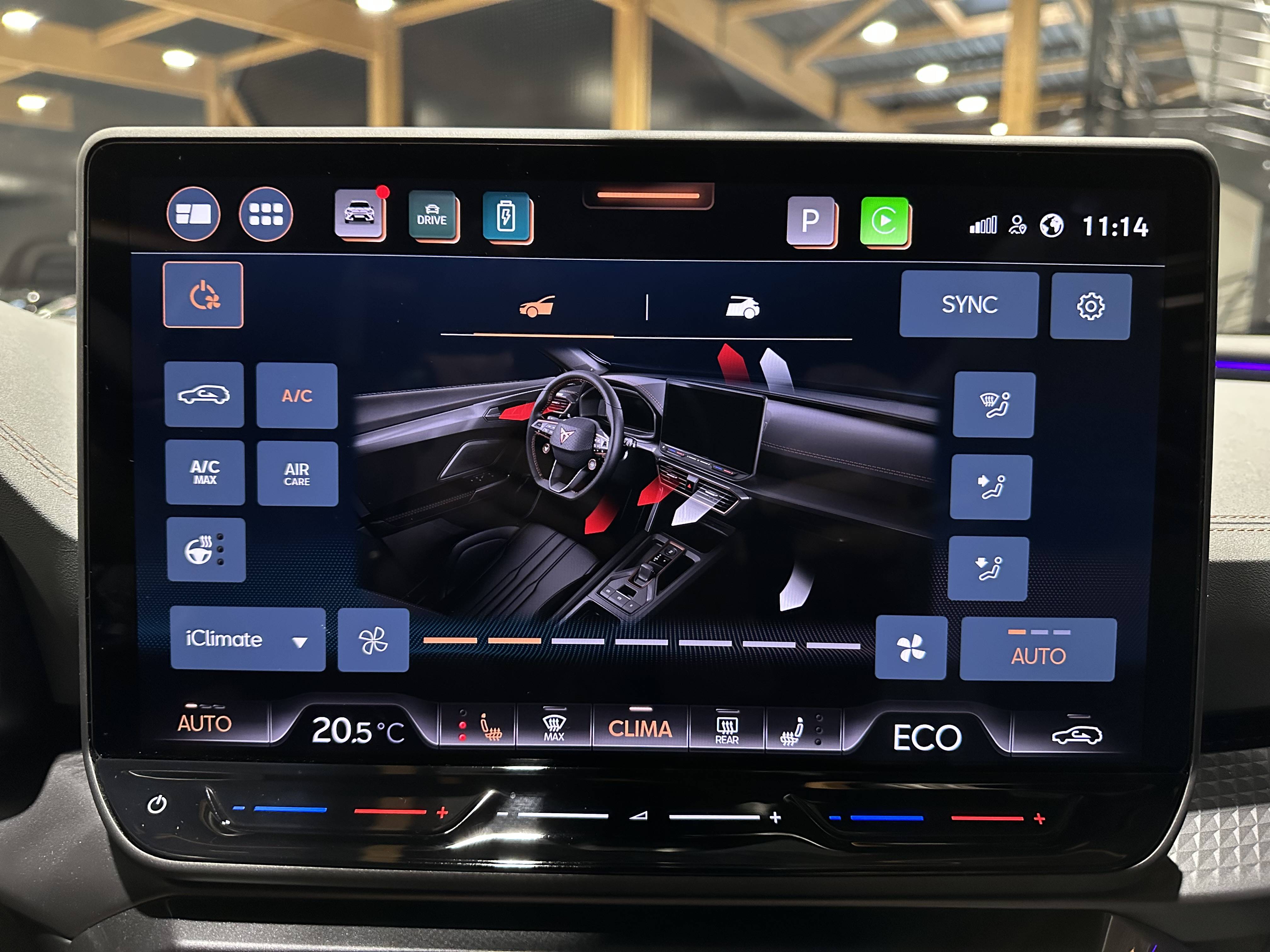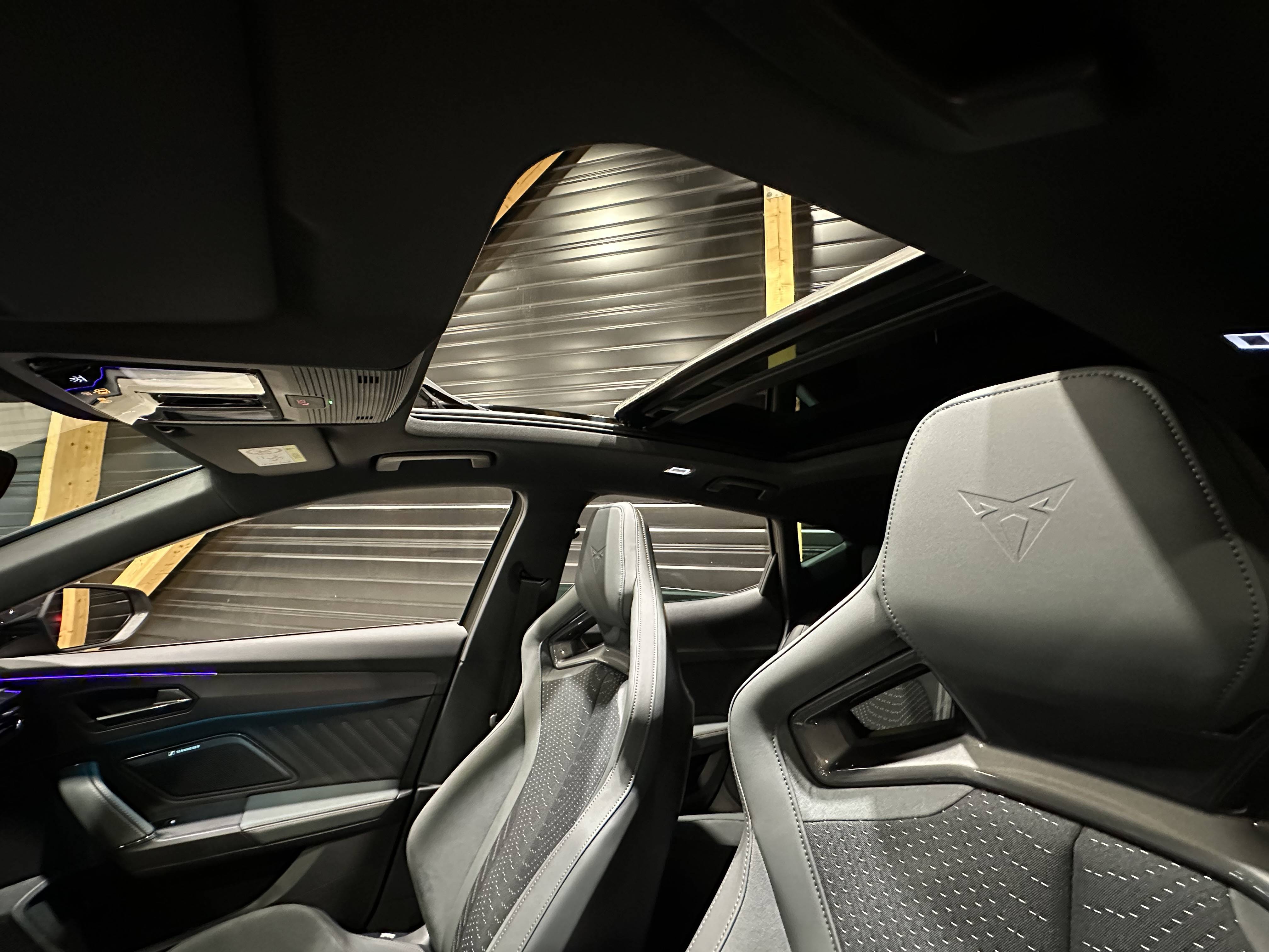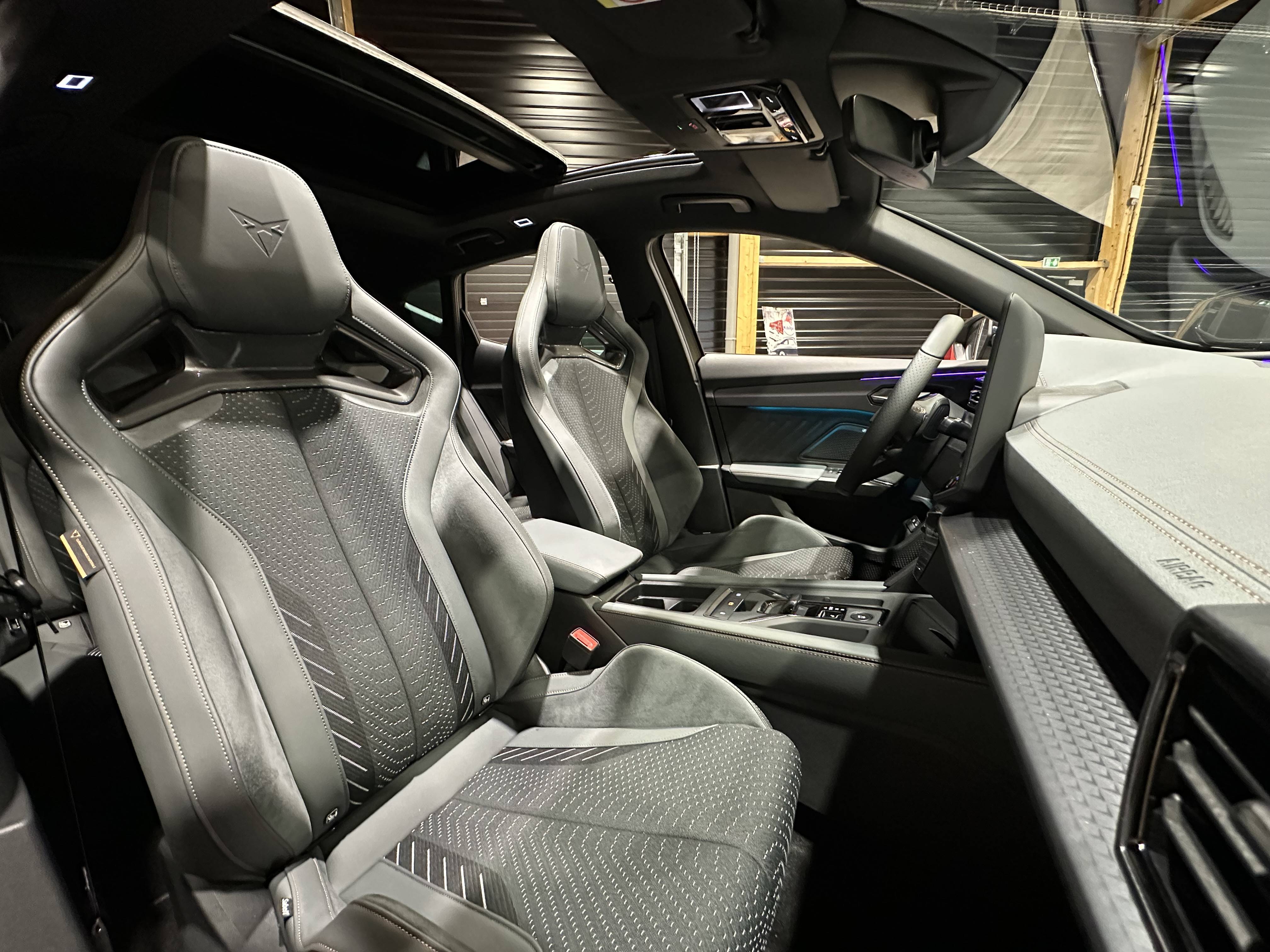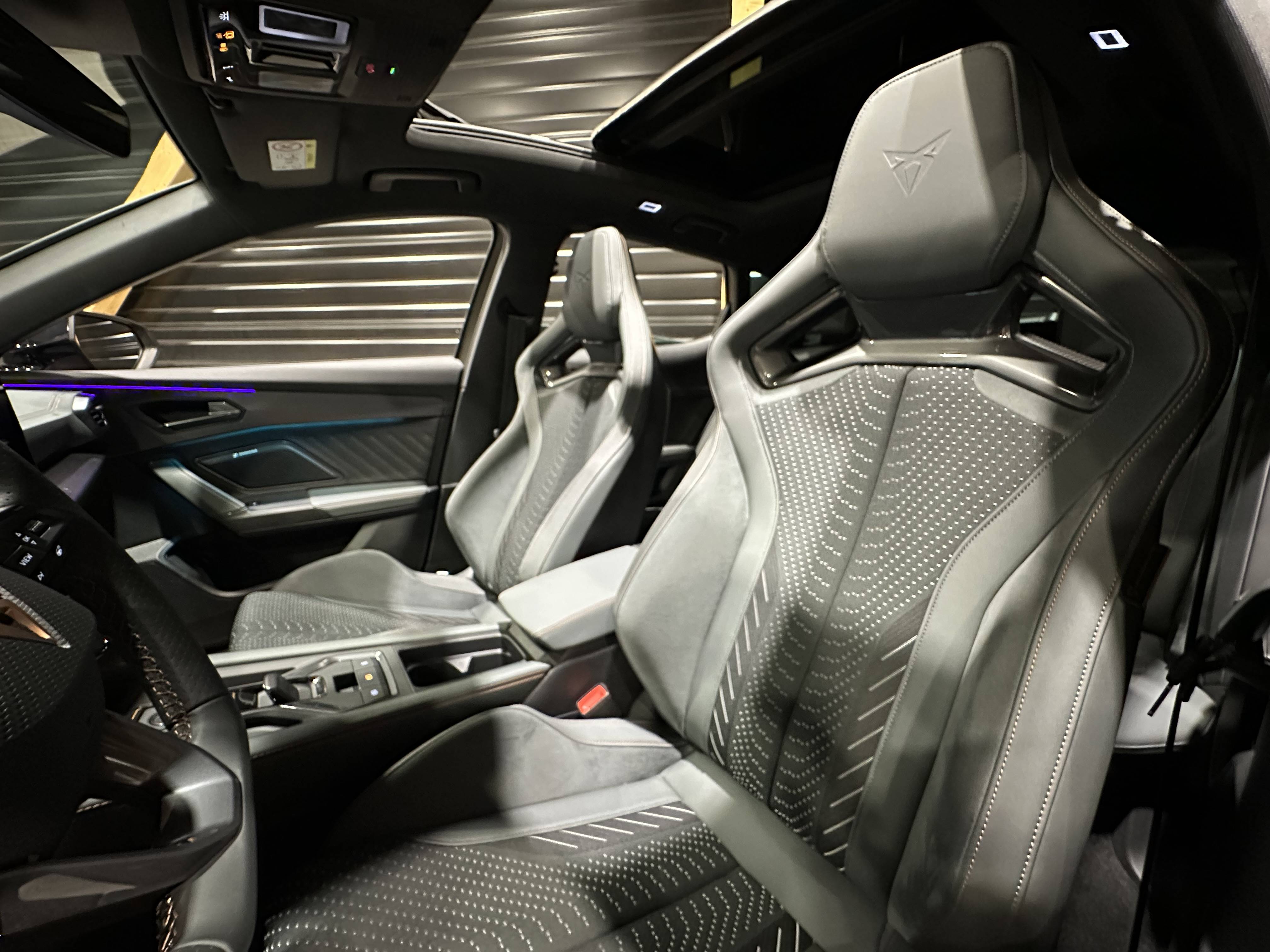 - Design intérieur Extreme - Sièges CupBucket tri-matière suédine et TEP Gris Encelade et textile paramétrique - Logos CUPRA estampés sur les appuie-têtes - Planche de bord Gris Encelade surpiquée avec inserts Dark Alu - Contre-portes en TEP noir surpiqués - Sièges conducteur et passager chauffants avec réglage électrique à mémoire, dont réglage lombaire