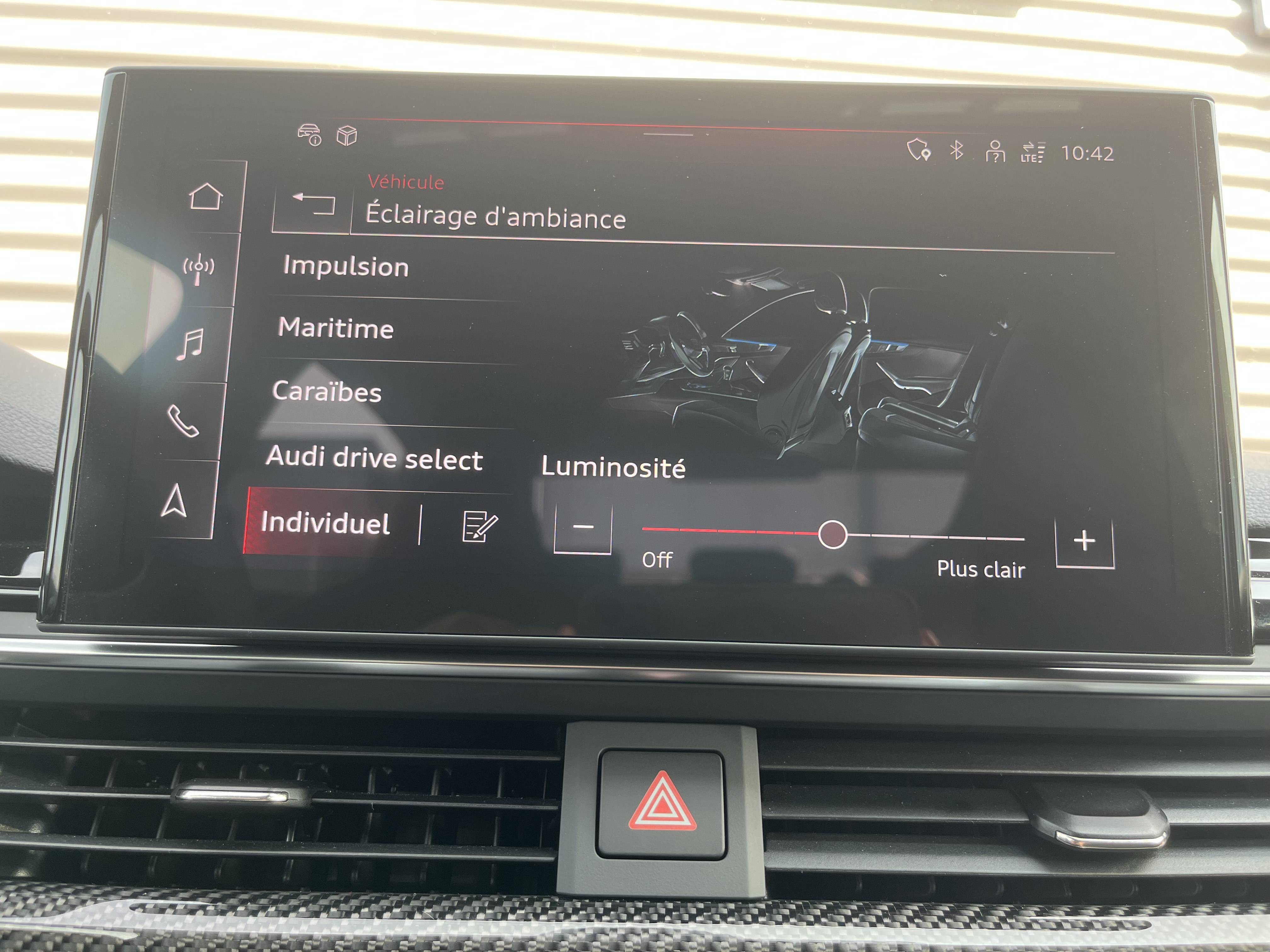 • Pack Eclairage d'Ambiance plus 3 profils de couleur prédéfinis ; un profil de couleur supplémentaire, interactif et personnalisé. 30 couleurs sont disponibles au choix pour un profil de couleur personnalisé. Les adaptations de teintes s'appliquent aux éclairages de contour et d'ambiance : . Éclairage des seuils de portières AR (blanc) . Porte-boissons à l'AV (multicolore) . Éclairage d'ambiance des portières AV/AR (multicolore) . Éclairage de contour des portières AV/AR (multicolore)